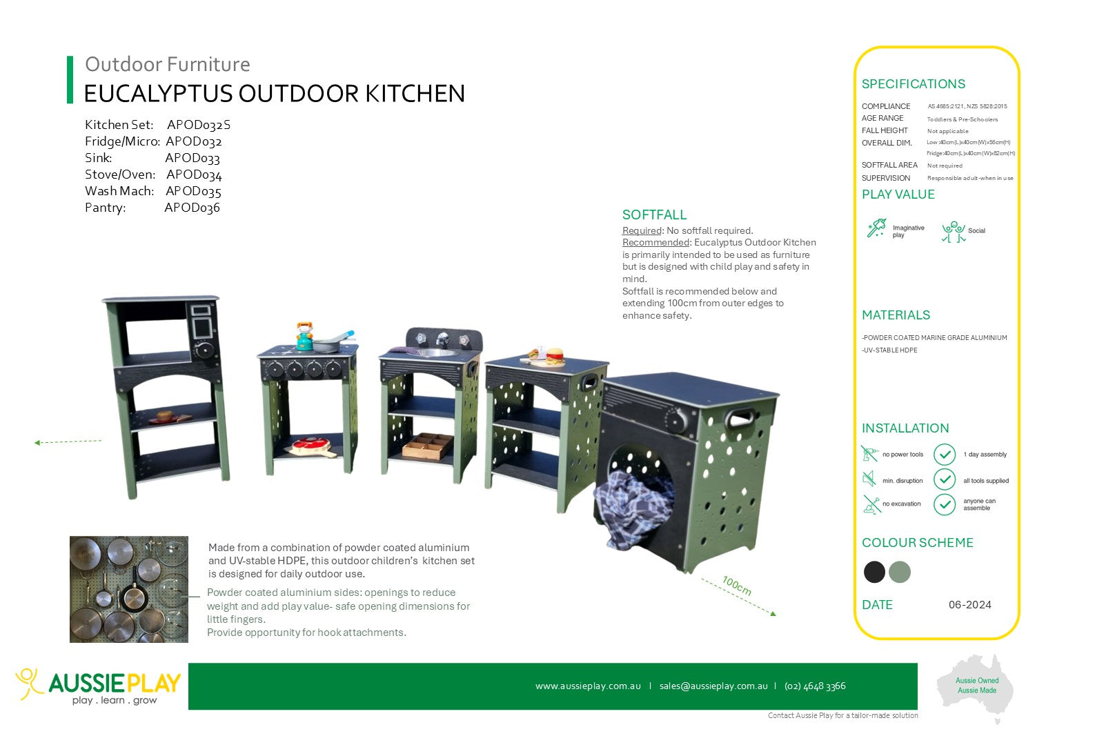 Eucalyptus Outdoor Fridge/Microwave, although intended to be used as furniture, is designed in accordance with AS4685:2121 & NZS5828:2015 to ensure safe play as well.