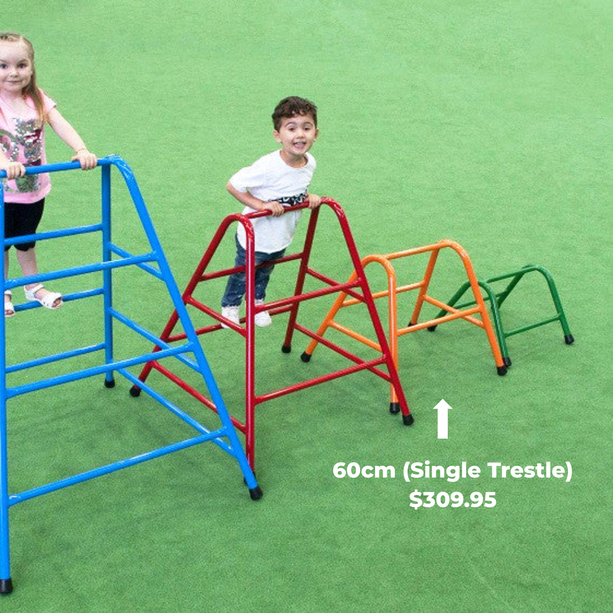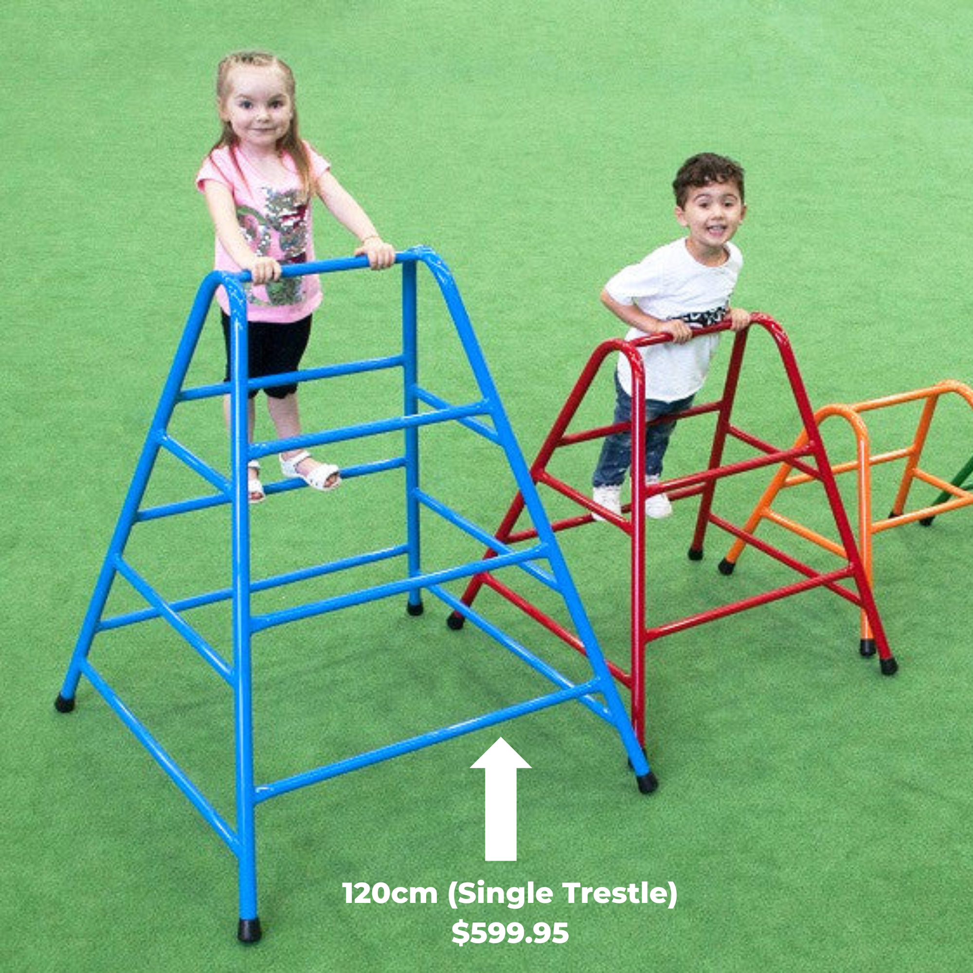 Aussie Play trestles all have a larger footprint and non-slip rubber foot for better stability and play value.