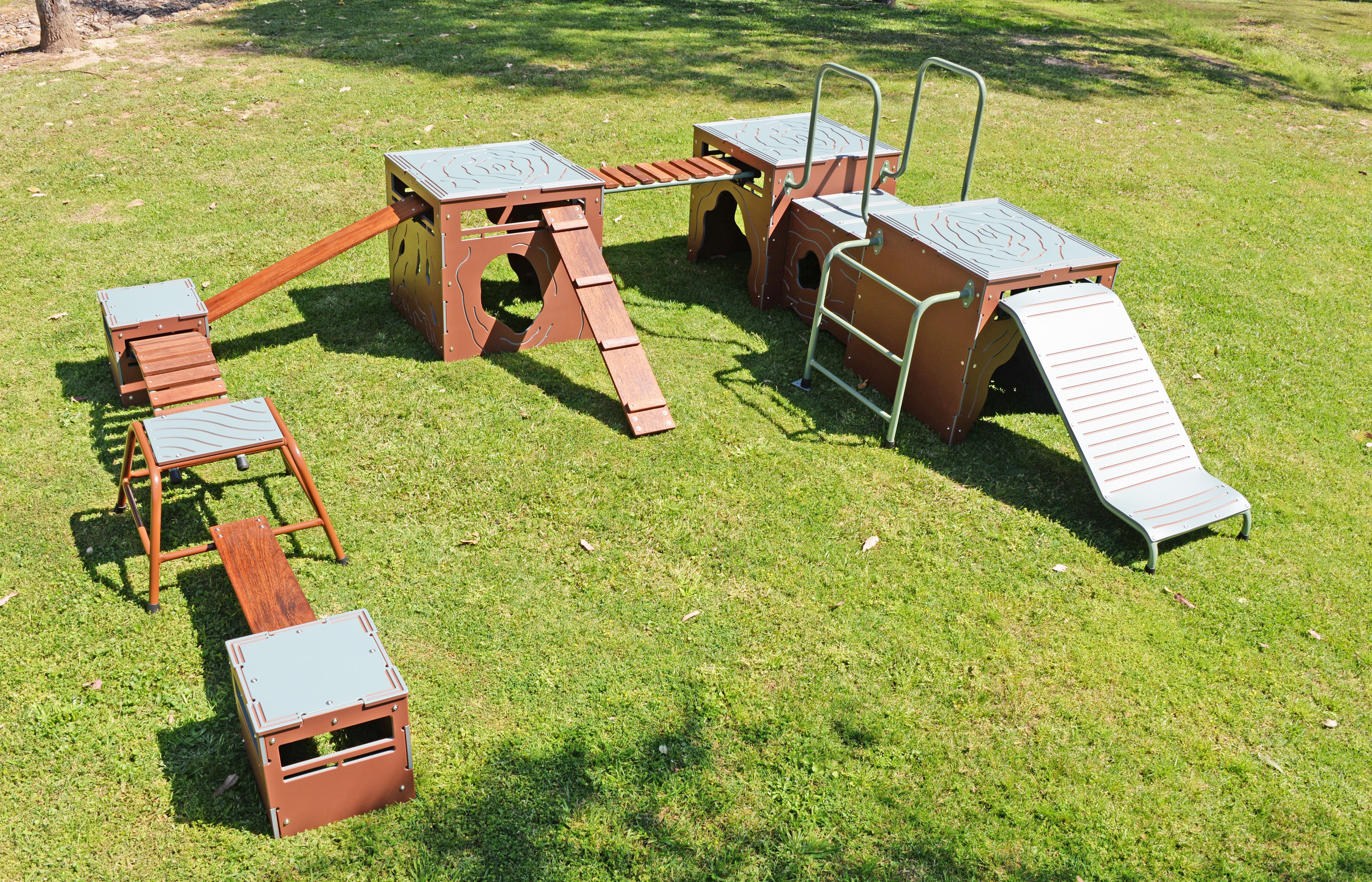 Set includes: 2x 80cm Nature Blocks, 1x Nature Blocks Log Tunnel, 2x Tunnel Handrail, 1x Grip Climber, 1x Nature Blocks Ladder, 3x 40cm Nature Blocks, 1x 120cm Walkboard, 1x 120cm Cleated Plank, 1x 90cm Walkboard, 1x Board Walk and 1x Curved Board Walk. (14 pieces)