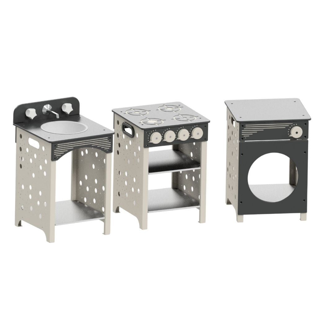 Designed with an Australian Pre-School environment in mind, the Kitchen Set can be used for imaginative, messy and collaborative play. Children will enjoy actual turning dials and taps and a real stainless steel sink