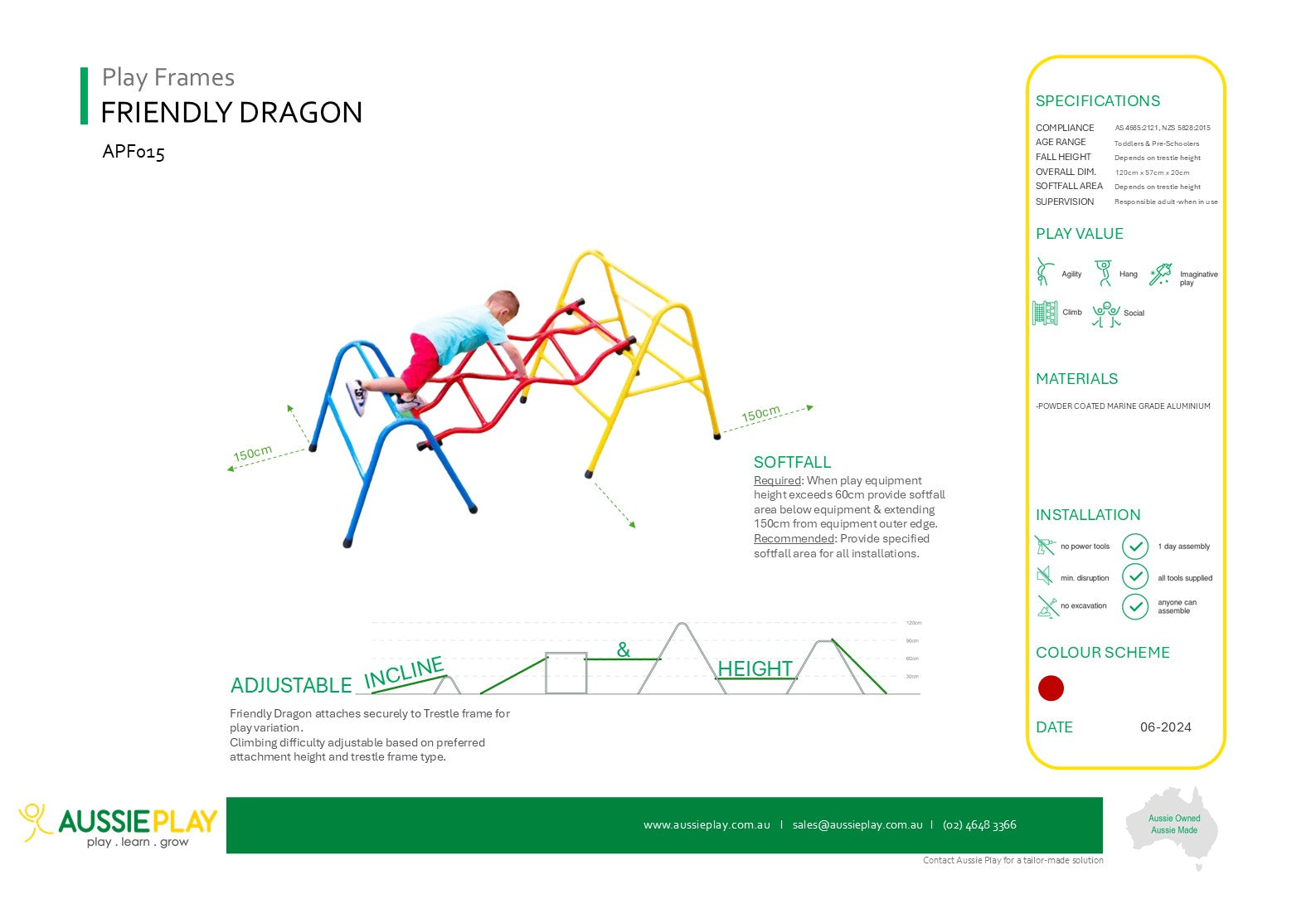 The Friendly Dragon attaches securely to one or two Aussie Play Trestles at a time for a stable and engaging play experience that adapts to children's abilities.