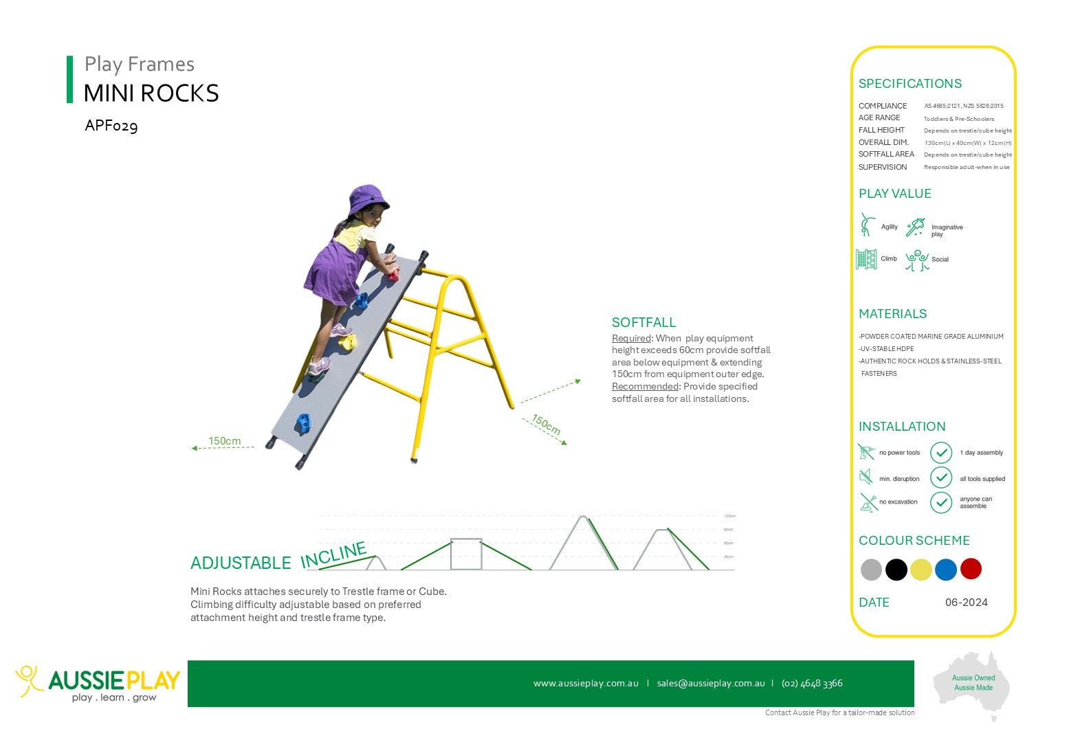 The Mini Rocks Climber is a smaller alternative to the Rugged Rocks Climber, designed to provide the same engaging climbing experience without requiring a wide trestle.