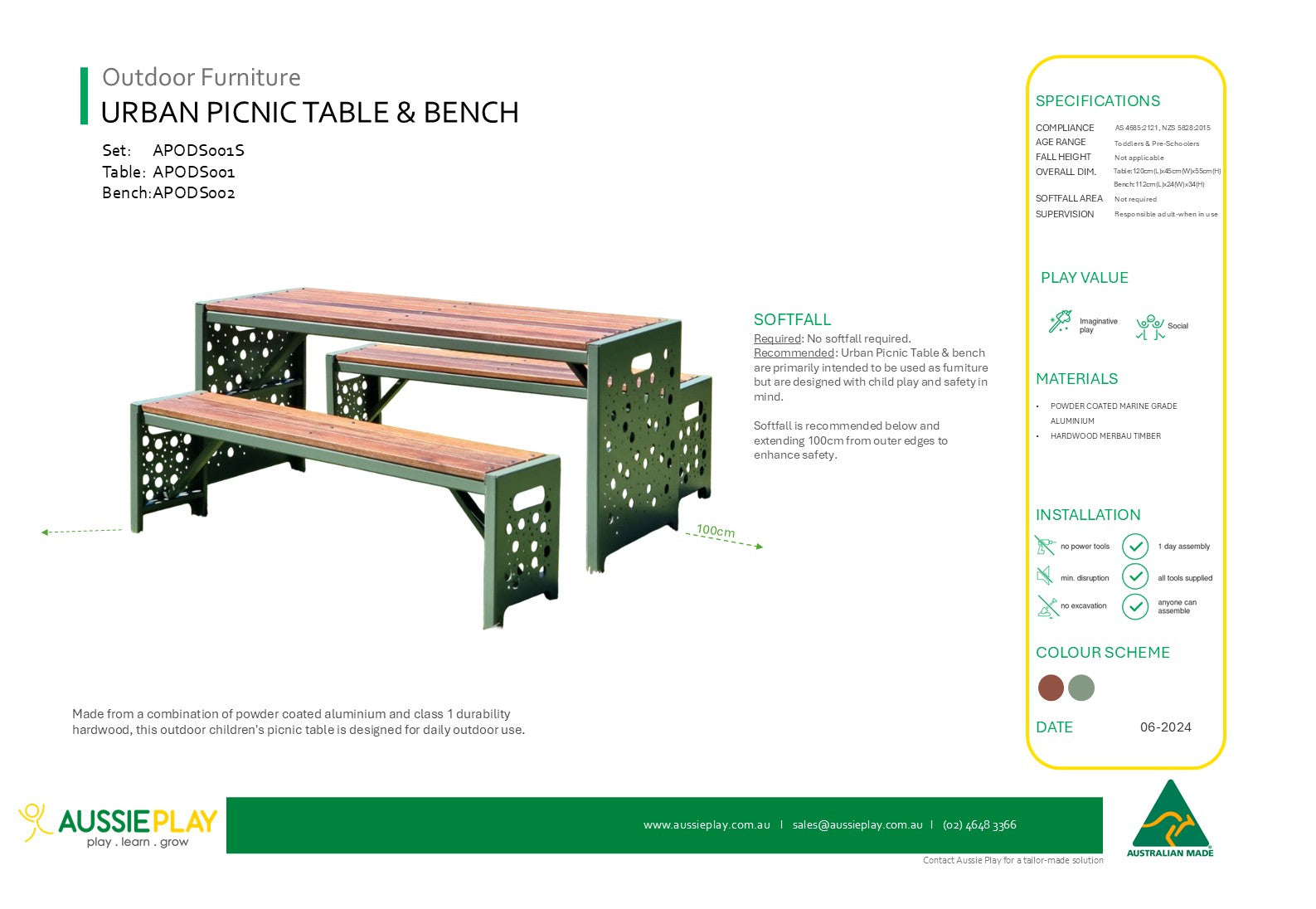Urban Picnic Table, although intended to be used as furniture, is designed in accordance with AS4685:2121 & NZS5828:2015 to ensure safe play as well.