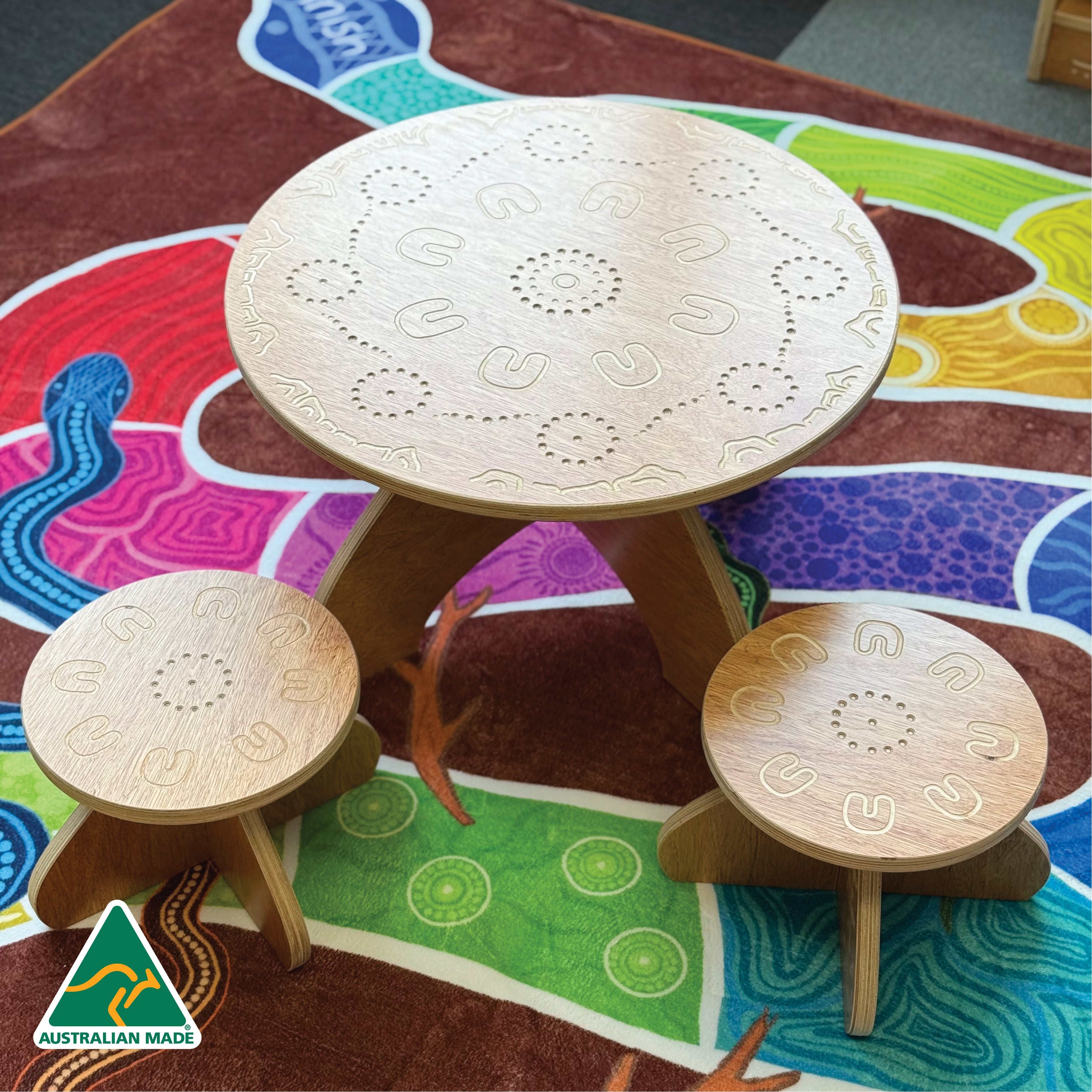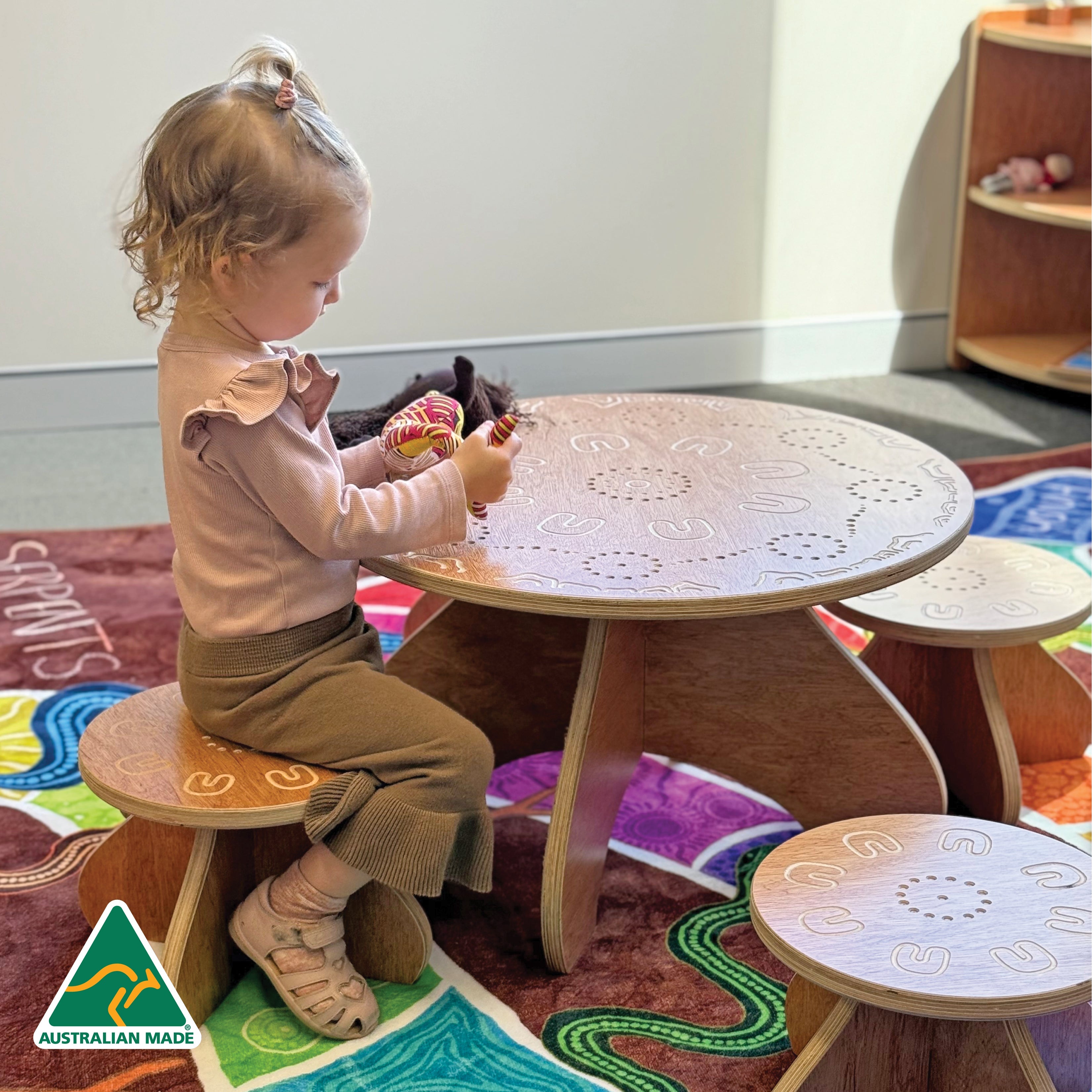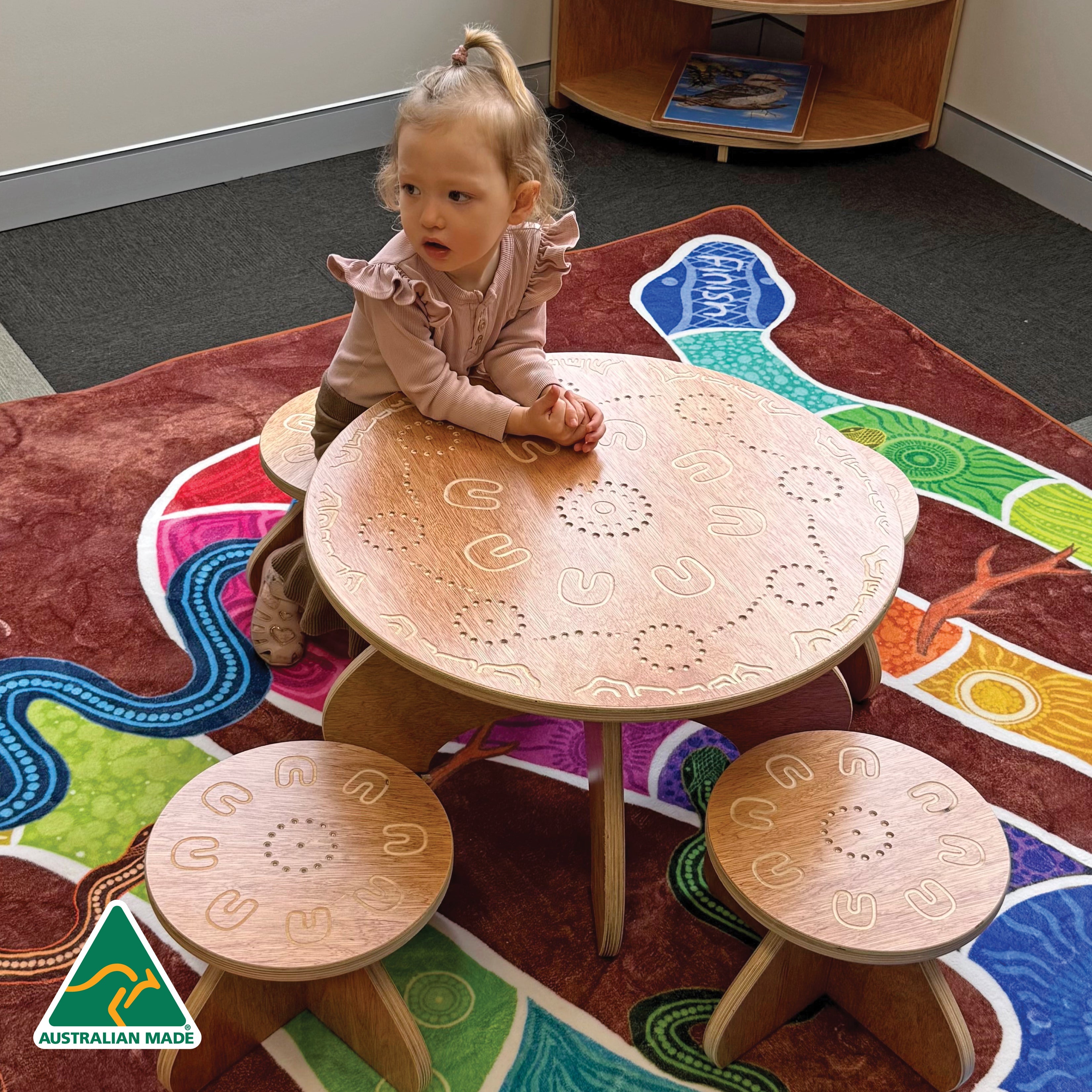 The table features meaningful Indigenous artwork by Aboriginal artist Shareen Clayton, honouring the cultural practice of yarning as a way to build relationships, reflect, and learn from one another. With multiple stool options available, this set is ideal for early learning spaces where community and communication are at the heart of the classroom experience. Functional, beautiful, and rich in cultural meaning – it’s more than just a table, it’s a place to connect.