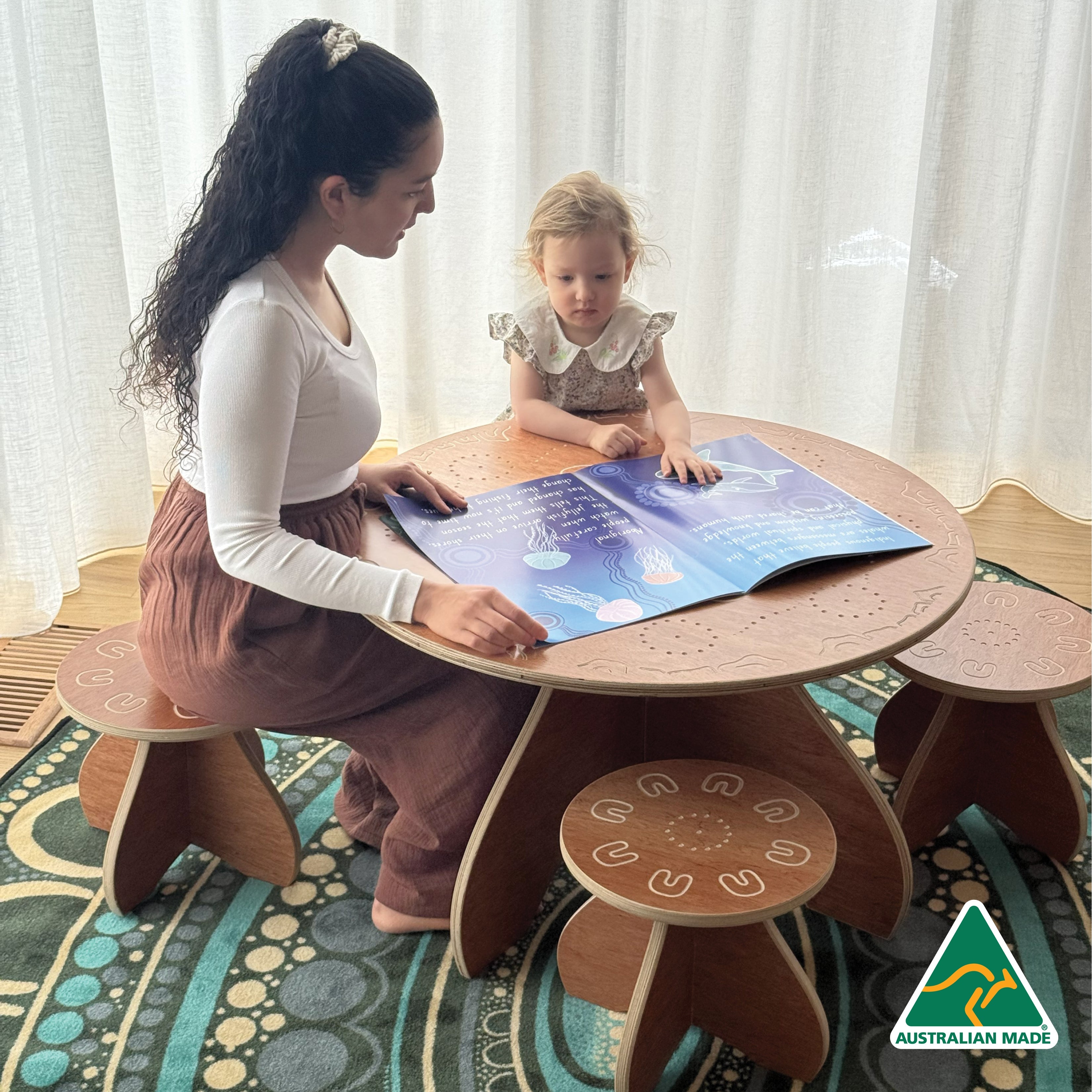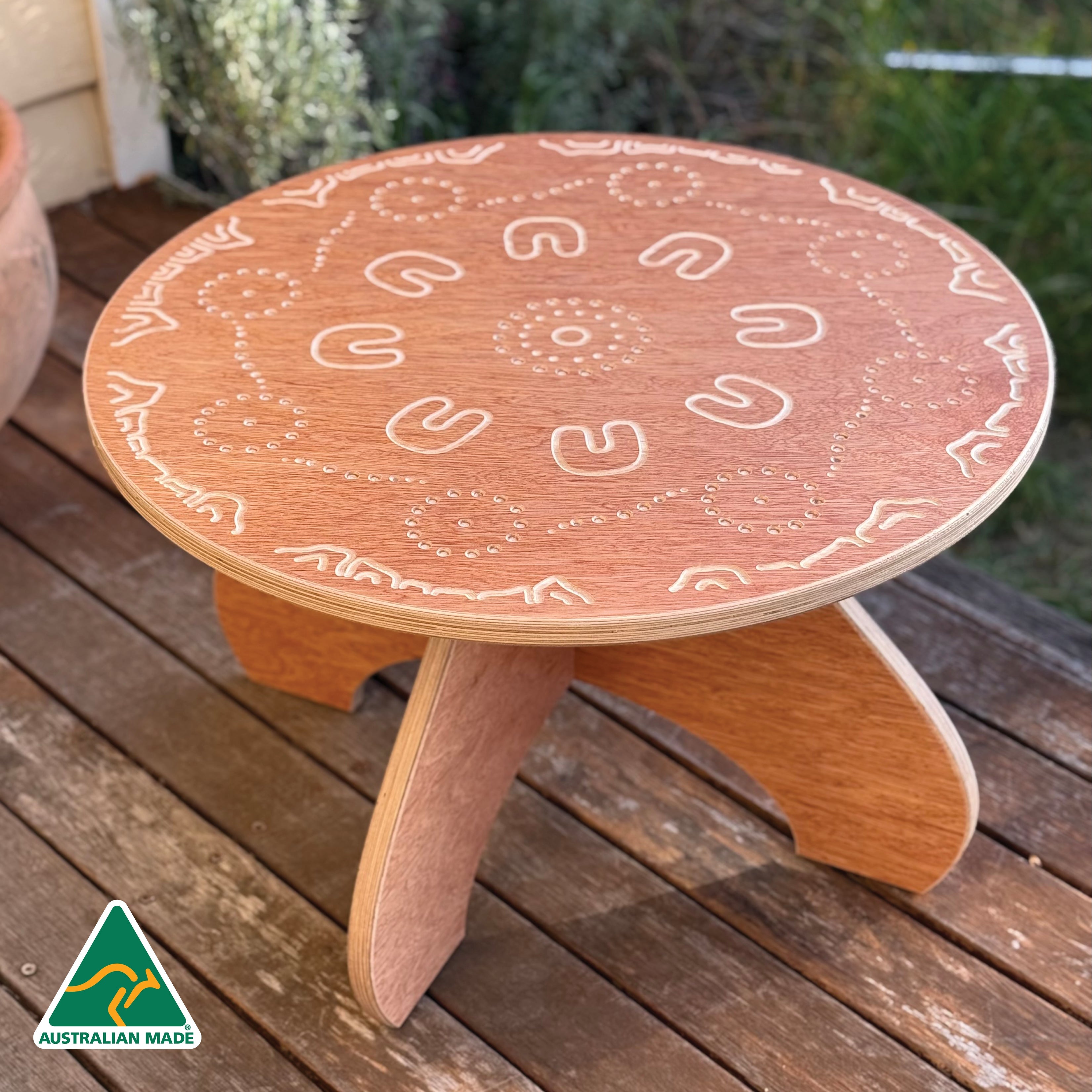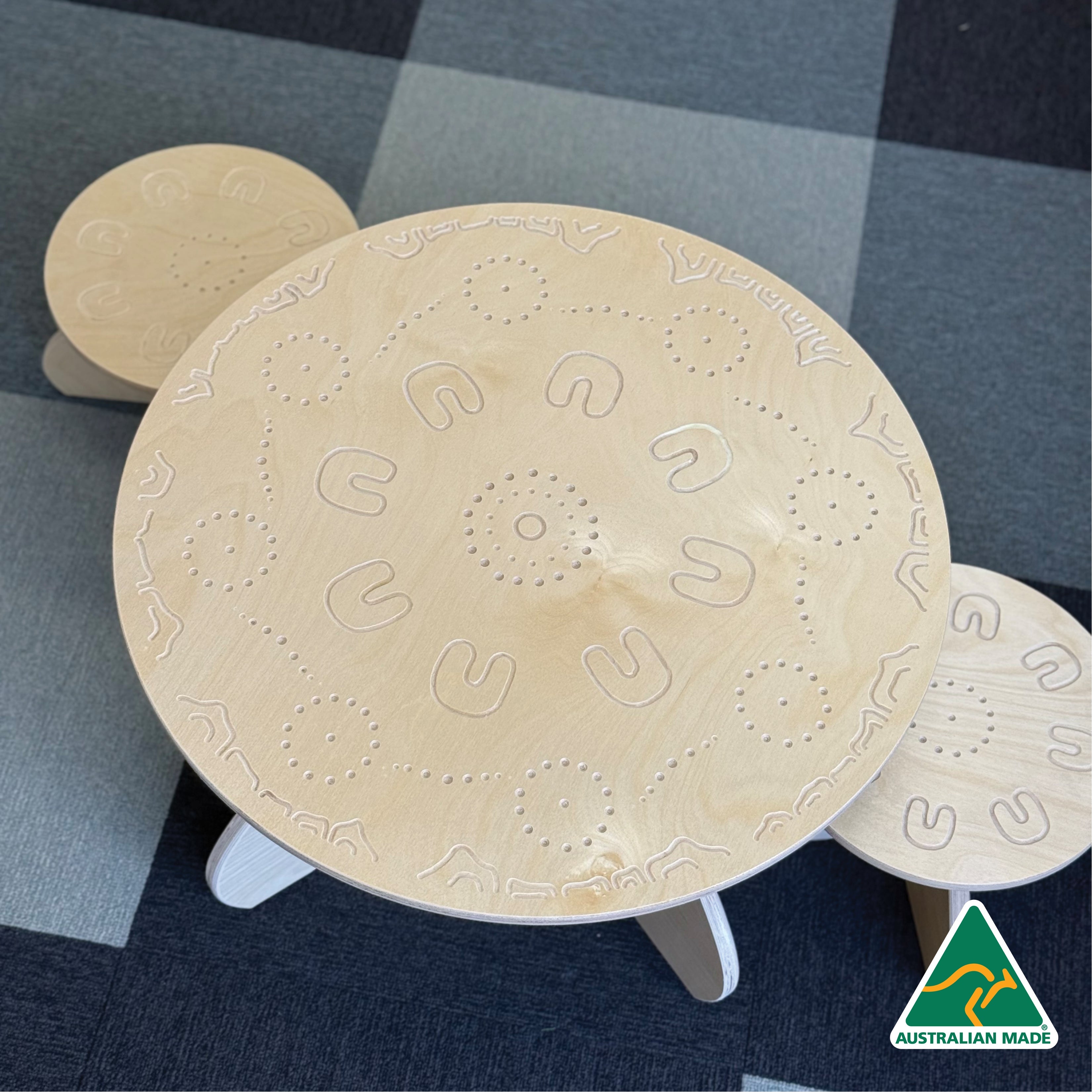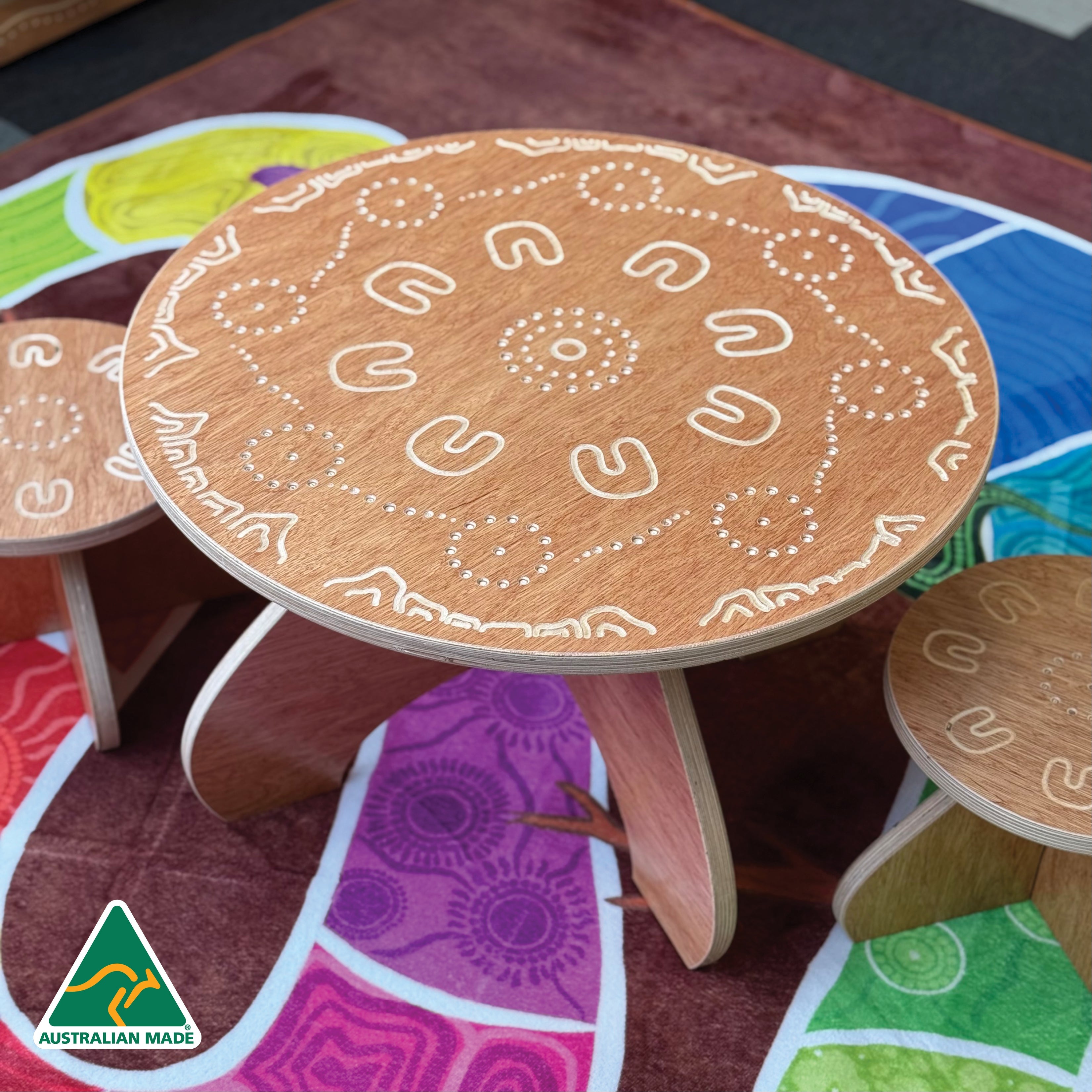 The table features meaningful Indigenous artwork by Aboriginal artist Shareen Clayton, honouring the cultural practice of yarning as a way to build relationships, reflect, and learn from one another. With multiple stool options available, this set is ideal for early learning spaces where community and communication are at the heart of the classroom experience. Functional, beautiful, and rich in cultural meaning – it’s more than just a table, it’s a place to connect.